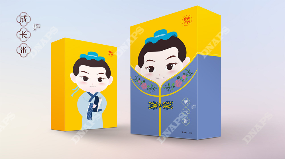 區(qū)別于傳統(tǒng)小米包裝,根據(jù)小米的不同搭配將小米分為月子米,成長(zhǎng)米,養(yǎng)顏米3類(lèi),視覺(jué)上分別以成對(duì)的嬰兒、小孩、年輕女性/媽媽為主要形象元素,采用現(xiàn)代插畫(huà)的形式創(chuàng)造三組萌趣生動(dòng)的形象,畫(huà)面生動(dòng)富有張力,配色清醒典雅,增強(qiáng)產(chǎn)品親和力。包裝盒外加設(shè)計(jì)有古典服飾圖形的封套,整體形式新穎富有層次感,拆掉封套將呈現(xiàn)另一幅畫(huà)面,開(kāi)盒有趣味,讓整體形成記憶點(diǎn)。
