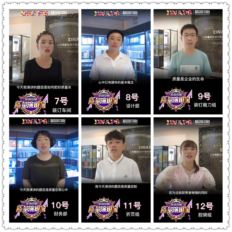 為了讓“質(zhì)量”意識深入人心,基因印刷組織了一場別開生面的“質(zhì)量演說家”演講比賽。負責人積極商討比賽形式,最后決定通過視頻錄制的形式公開發(fā)布在線上請客戶和全體員工投票。票選出的優(yōu)秀代表在本周六的質(zhì)量大會上進行現(xiàn)場的演講。新穎的比賽形式激發(fā)了全體員工的熱情,各部門員工踴躍參與,利用早會和空余時間進行練習和彩排,最后共有16人脫穎而出。不同部門的員工從不同的角度詮釋了自己對“質(zhì)量”的理解,一遍遍的練習,一遍遍的重復(fù),不僅演講人自己,聽的人也在不知不覺中對“質(zhì)量”有了自己的思考。
